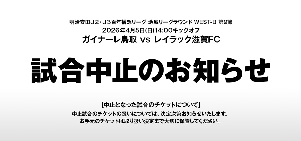 クラブ2026年04月04日明治安⽥J2・J3百年構想リーグ 第 9 節 ガイナーレ鳥取vs.レイラック滋賀FC 試合中止のお知らせ