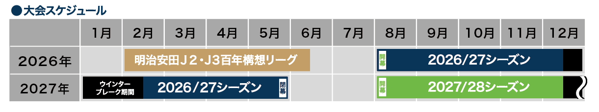 2026年はJリーグのシーズン移行が行われます。移行に伴い2026年のみ開催される特別大会「明治安田J2・J3百年構想リーグ」(2026年2月~2026年6月予定)と2026/27シーズン(2026年8月~2027年5月予定)が開催されます。