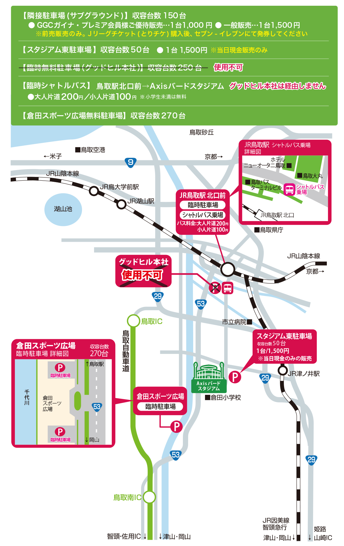 ・「スタジアム隣接駐車場」は「とりチケ」にてご購入ください (試合開始3時間前より開場)